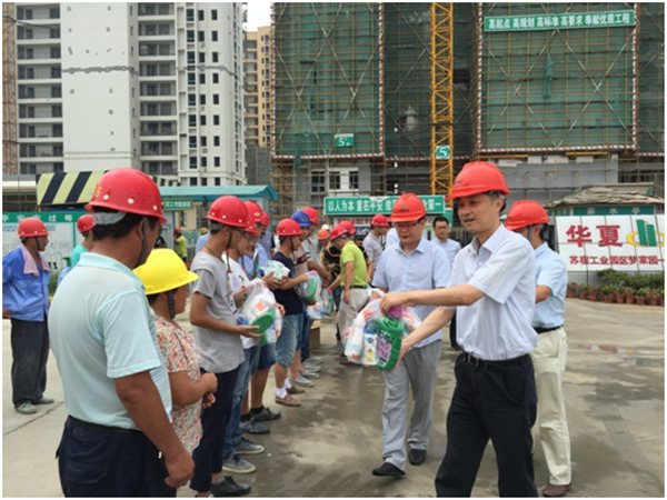 2016年7月27日上午,為切實(shí)做好建筑工地防暑降溫工作,讓施工人員在溫馨的工作環(huán)境中安全作業(yè),園區(qū)黨工委委員、管委會副主任、規(guī)劃建設(shè)局局長許紹杰、副局長張循在開發(fā)公司副總裁劉建華的陪同下冒著酷暑慰問夢家園工地一線施工人員。