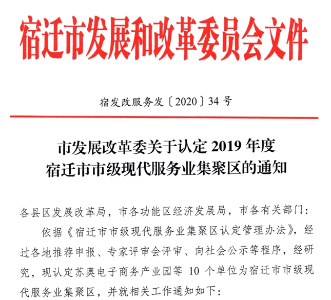近日,根據(jù)《市發(fā)展改革委關(guān)于認定2019年度宿遷市市級現(xiàn)代服務業(yè)聚集區(qū)的通知》,蘇宿園區(qū)生產(chǎn)力中心成功創(chuàng)成宿遷市市級現(xiàn)代服務業(yè)聚集區(qū)。