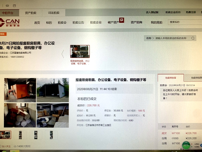 8月21日上午10時(shí),城發(fā)公司報(bào)廢廚具、辦公設(shè)備、電子設(shè)備、鋼構(gòu)棚子等物資網(wǎng)上拍賣開始,7家競買人,經(jīng)過1小時(shí)44分10秒244次的緊張激烈競價(jià),最終以228700元成交標(biāo)的,比評估價(jià)90200元高出138500元,溢價(jià)率153.55%。